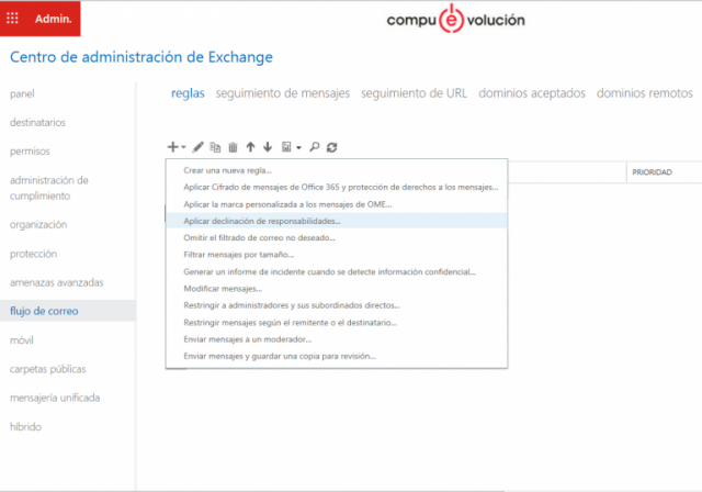 En el menú izquierdo ve a flujo de correo y en el menú superior a reglas. Luego da clic en el botón de nuevo y seleccionamos “Aplicar declinación de responsabilidades”.