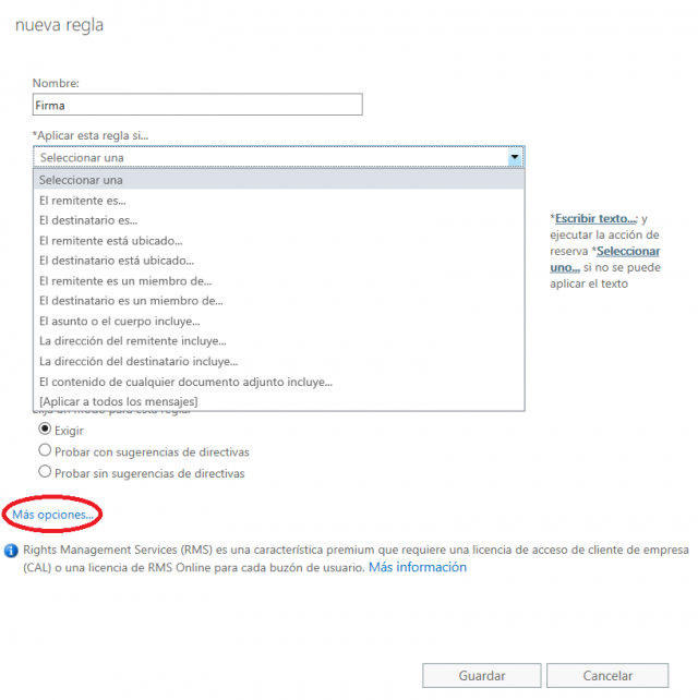 En la ventana emergente le damos un nombre a nuestra regla por ejemplo “Firma” y en la siguiente opción de “Aplicar esta regla si…” vamos a seleccionar a quiénes queremos que se les aplique la firma. Por ejemplo si el remitente es cierta persona, pertenece a cierto grupo o su dirección es de cierto dominio. Podemos dar clic en Más opciones para ver todas las posibilidades.