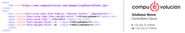 - Para rellenar automáticamente datos como el nombre, el puesto, el teléfono, etc. puedes referenciar atributos del directorio de Office 365 con el nombre del atributo entre signos de porcentaje: %%DisplayName%%, %%Title%%, %%MobilePhone%%, %%PhoneNumber%%, %%Email%%. Será indispensable tener estos atributos bien llenados en tu directorio. Puedes ver la lista completa de atributos en la siguiente liga: https://docs.microsoft.com/en-us/exchange/policy-and-compliance/mail-flow-rules/conditions-and-exceptions?view=exchserver-2019#property-types