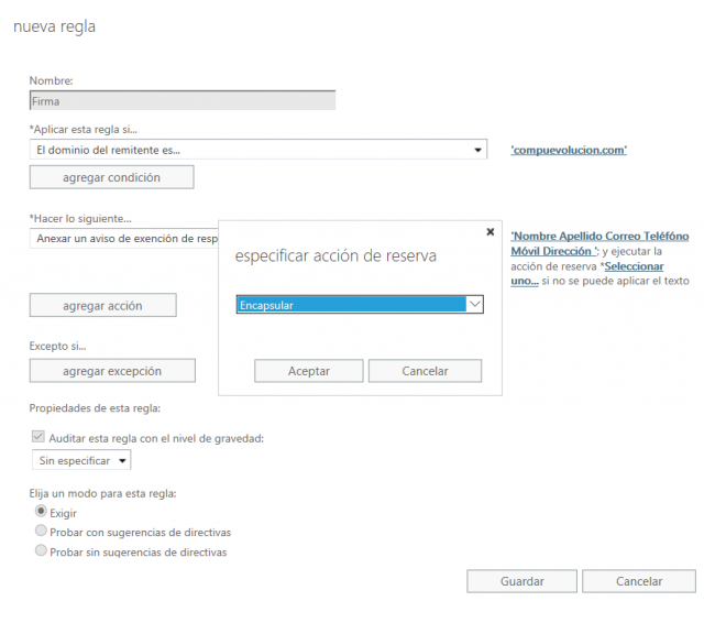Nota: Este tipo de regla en realidad está pensada, como lo dice el nombre, para agregar un “disclaimer” o aviso de exención de responsabilidad, por lo que siempre va a agregar lo que hayamos puesto en el texto hasta abajo de toda la cadena de correos. Es por eso que recomendamos únicamente poner la firma en correos nuevos y NO en respuestas o reenvíos, pues en esos casos nuestra firma no aparecería inmediatamente después de nuestro texto si no hasta el final de todos los mensajes.