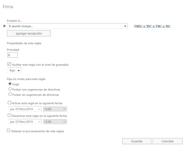 Para aplicar esta excepción damos clic en agregar excepción, seleccionamos “el asunto incluye…” y agregamos estas palabras que son las que se usan si usamos el Outlook en inglés o español: FW:, RV:, FW:, RE:
