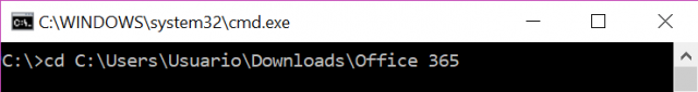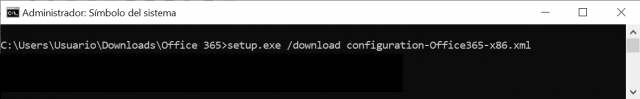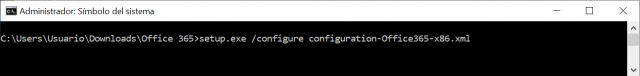 Una vez que tengamos nuestro xml debemos abrir una línea de comandos ejecutándola como administrador e ir a la ruta donde descargamos nuestra herramienta de Office Deployment y donde se encuentran los archivos setup y xml. Esto podemos hacerlo con el comando cd seguido de la ruta de la carpeta que podemos copiar y pegar.